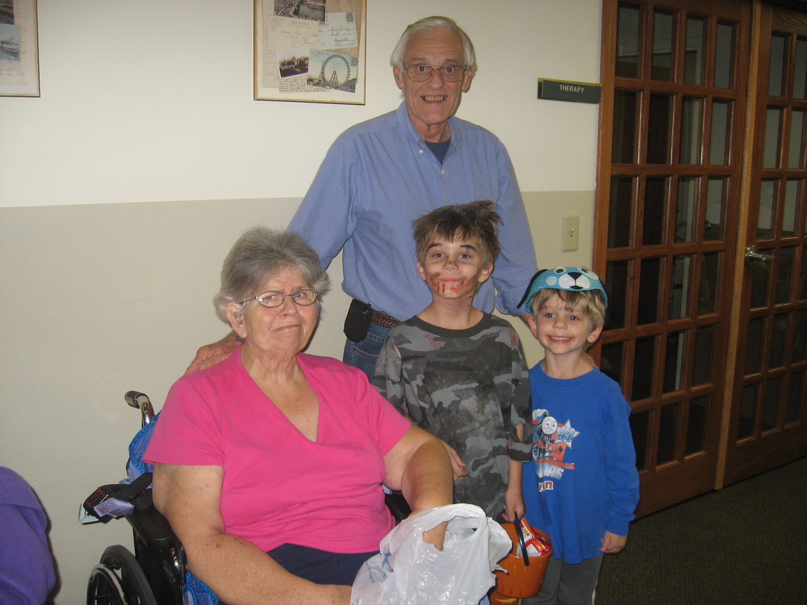 Well, Arla had hoards of trick or treaters visit her this evening. Tonight was an hour of trick or treating at Vancrest. Harold let Mary Ann know to bring out Erik and Evan. We were not sure what to expect, but there is nothing more meaningful than watching children interact with the residents of Vancrest. There were a lot of people and a lot of noise, but everyone was happy and enjoying the event. And Arla was no exception. She was enjoying passing out the candy to those children who came to participate. And she was overjoyed to see Erik and Evan….even though Erik was dressed as a brain-eating zombie.